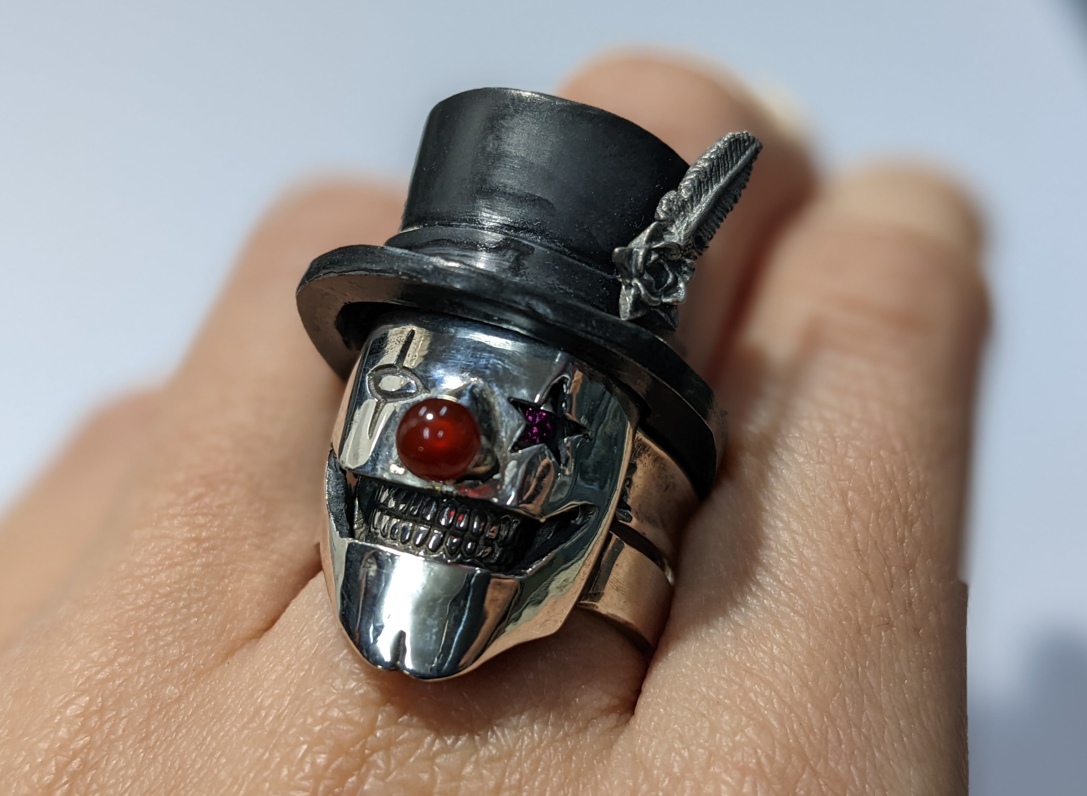 スカル・マスク・シルクハットの三連で単独でつけていただいたり、スカルとシルクハット、仮面とスカル、といった組み換えも可能です。